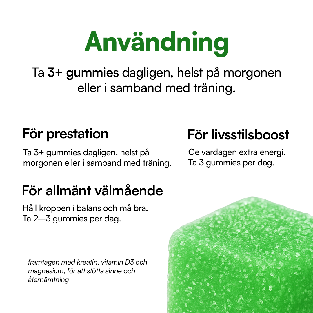 Tillverkade med kreatinmonohydrat är våra gummis utformade för att maximera din prestation och hålla dig på topp.