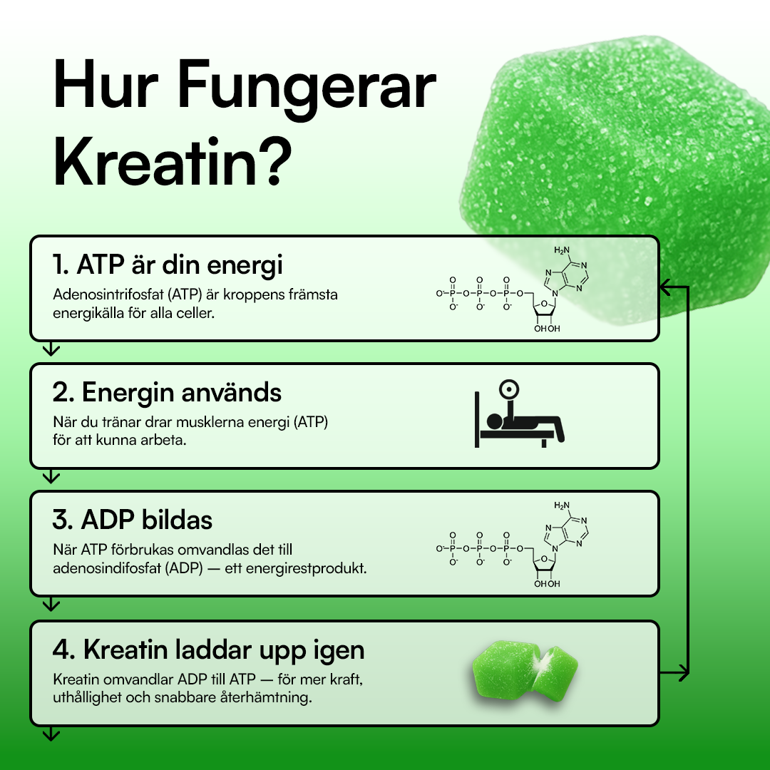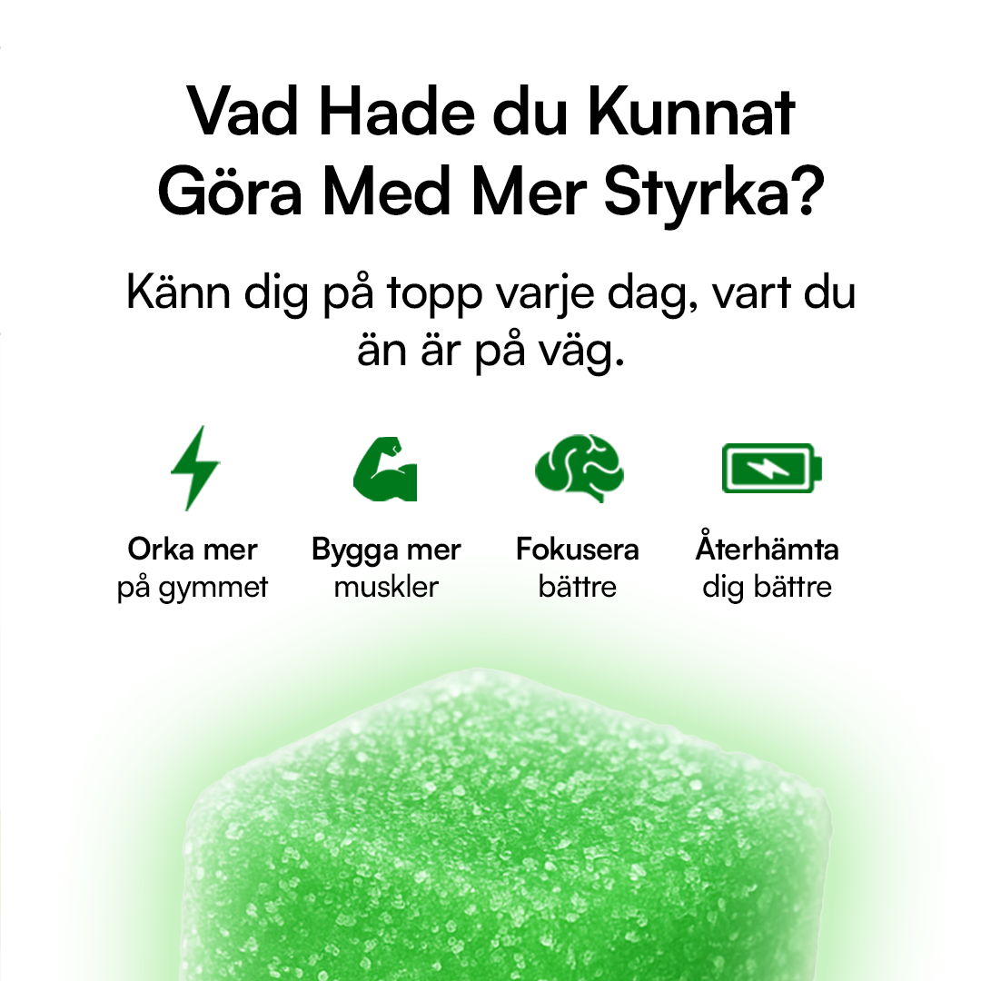 Vårt mål är att göra kreatin mer njutbart och tillgängligt med goda gummis som ersätter den grusiga eftersmaken.