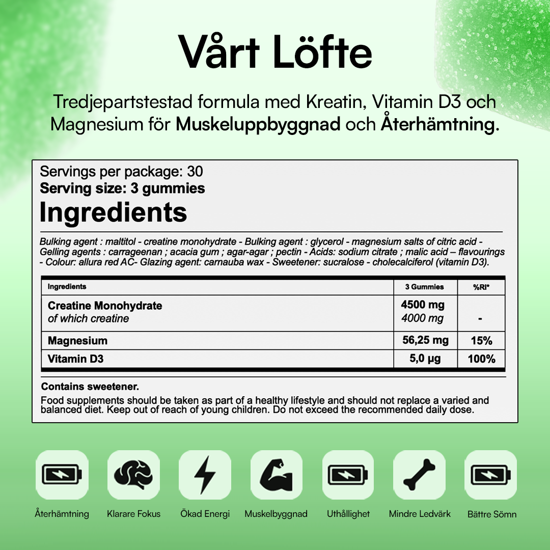 Våra gummis är tillverkade med rena och noggrant utvalda ingredienser, utan onödiga eller konstiga tillsatser. De innehåller kreatinmonohydrat, naturliga smaker och sötningsmedel för en god smak, samt ingredienser som säkerställer rätt konsistens och hållbarhet.