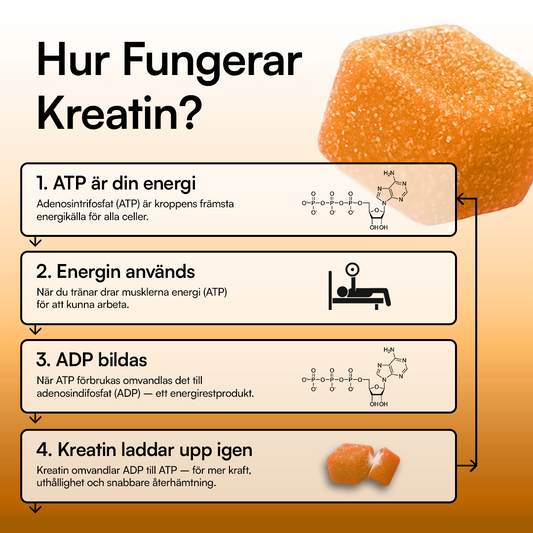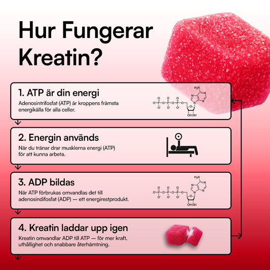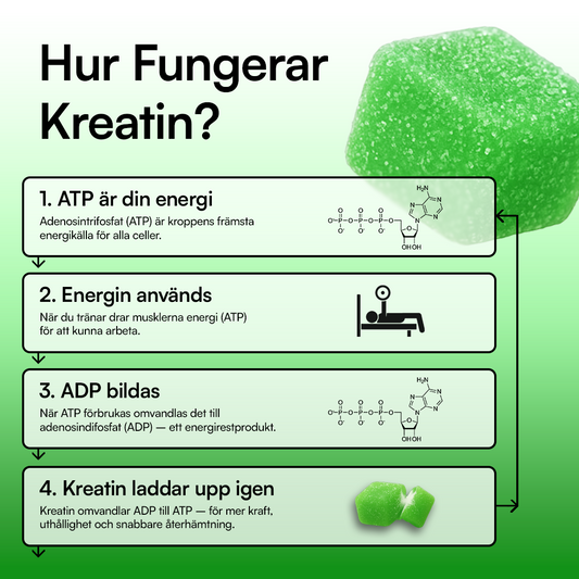 Kreatin fungerar genom att öka kroppens förmåga att producera ATP, vilket är den primära energikällan för muskel-kontraktioner under högintensiv träning.